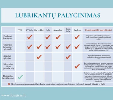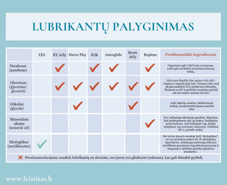 Lytinių santykių metu atsirandanti trintis gali sudirginti šlaplę ir aplinkinius audinius, ypač jei natūralios lubrikacijos nepakanka, bei lengviau įstumti bakterijas į pūslę. Naudojant švelnų, bekvapį lubrikantą galima sumažinti mechaninį dirginimą ir taip sumažinti ŠTI riziką. Žemiau pateikiama lentelė, kuri padės išsirinkti tinkamiausią lubrikantą.